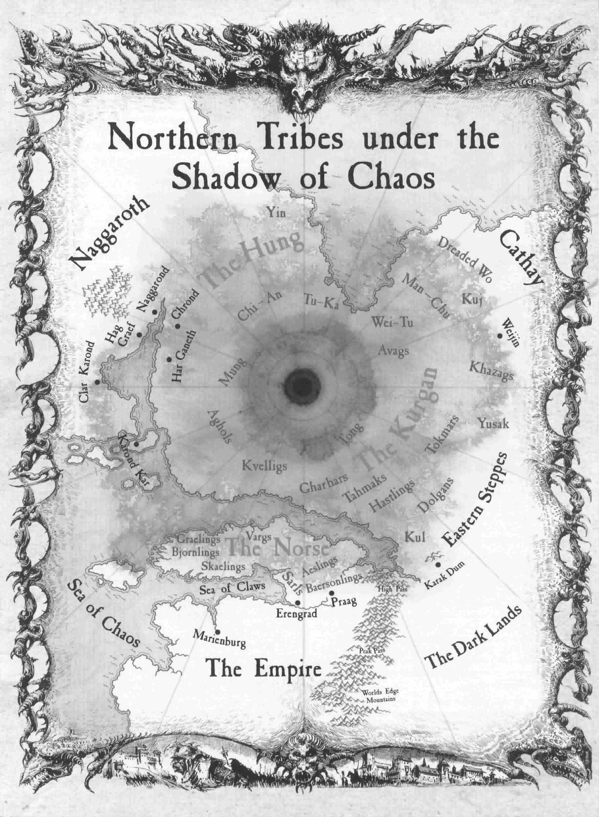 In terms of geography, Warhammer originally adopted a Eurocentric setting from Tolkien’s The Lord of the Rings. This is clear from the maps of The Old World. Ulthuan is equivalent to Atlantis in shape, position, etc. As the home of the Elves, a haughty, proud, yet ultimately declining race of blonde-haired, blue-eyed humanoids, we can say that this presents a portion of the old myth of Hyperborea so often seen in various edits on the Internet. The myth of Hyperborea is still present even when discussing the tribes inhabiting the Chaos Wastes in the northern arctic regions of the Warhammer world. The Chaos Wastes extend across the entire frozen north, and even into the “Eastern Steppes.” The “Northmen” are chaos worshippers in-universe. Perhaps this is a fantastic example of cultural memory preserving a narrative from the margins of political discourse: that of the various steppe peoples of Indo–European fame. I mean, seriously, it’s even got the same name: The Kurgan. As in: The Kurgan Hypothesis.